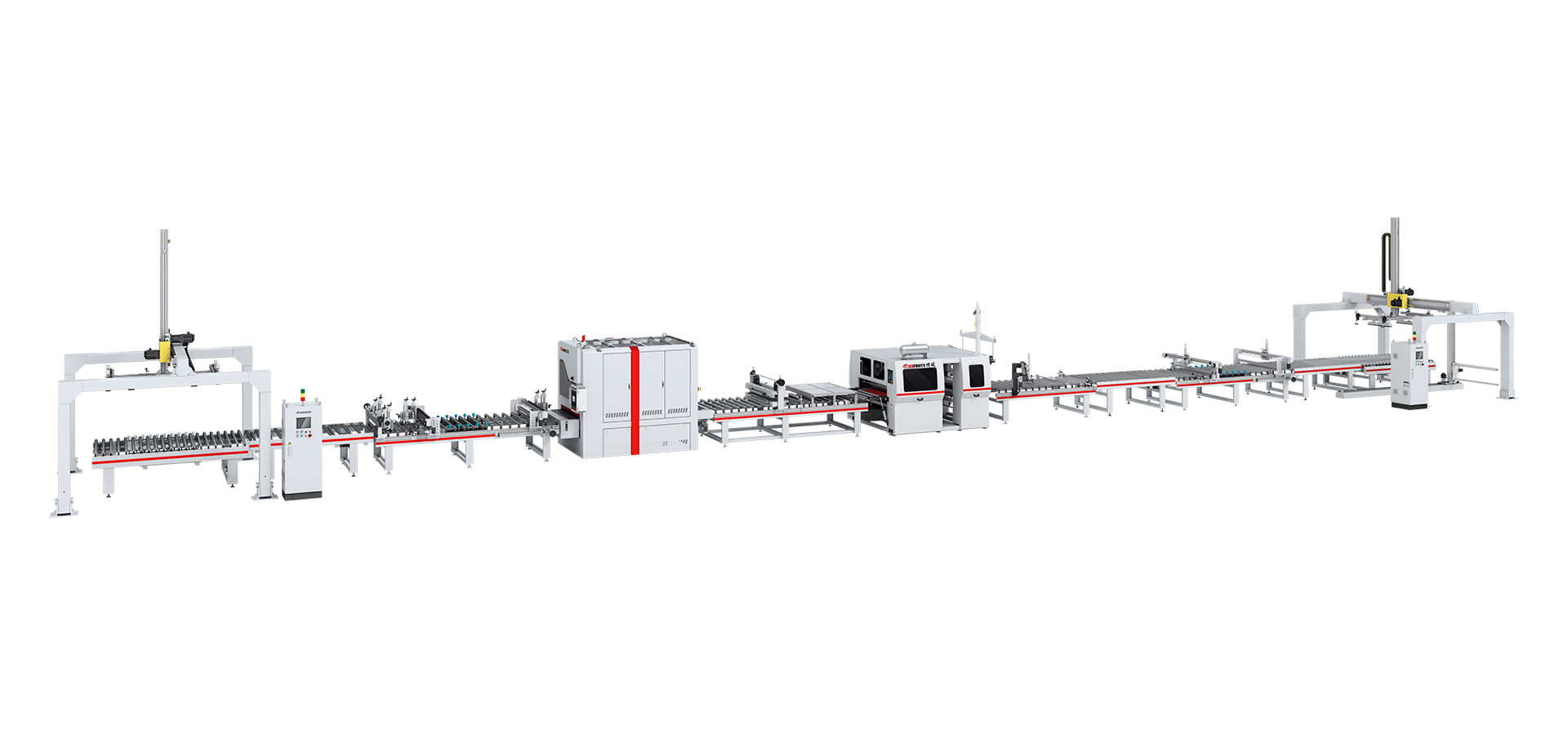 本生產(chǎn)線由:龍門上下料機 — 對中輸送機 — 輸送機 — 倒角機 — 砂光機 — 粉塵清除機 — PUR平貼機(含溶膠系統(tǒng)) — 斜切機 — 輸送機 — 精密修邊機 — 輸送機 — 對中輸送機 — 龍門上下料機 — 拉膜機等部分組成。