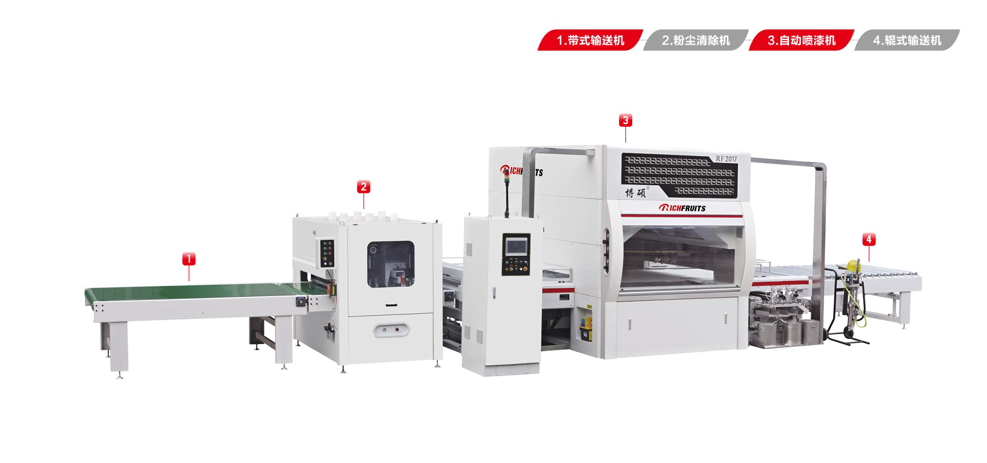 適用于板式家具、實木門、櫥柜門、工藝品、裝飾板、硅酸鈣板、玻鎂板、水泥纖維板的板式加工件的平面和四個側邊進行高質(zhì)量、大批量連續(xù)噴漆。