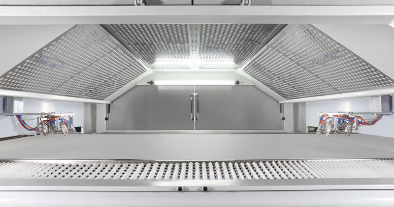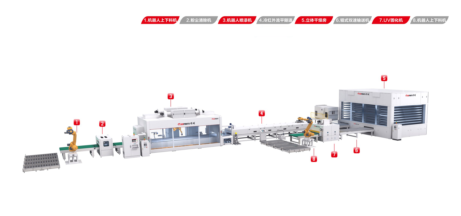 適用于板式家具、實木門、櫥柜門、工藝品、裝飾板、硅酸鈣板、玻鎂板、水泥纖維板的板式加工件的平面和四個側(cè)邊進行高質(zhì)量、大批量連續(xù)噴漆。